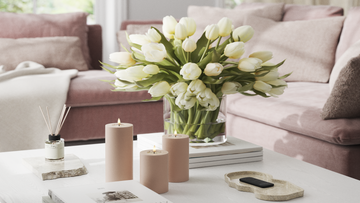 For et roligt helhedsindtryk kan du samle lysene på et fad og variere højderne, mens farverne holdes i samme palette.