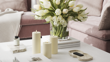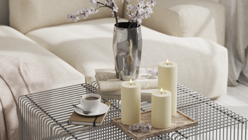 Brug bloklys i små grupper med forskellige højder. Det giver dybde og et gennemført udtryk i indretningen.